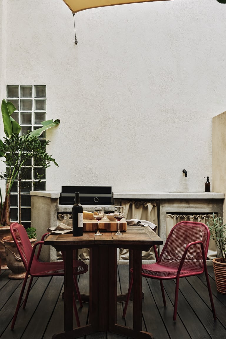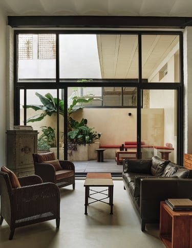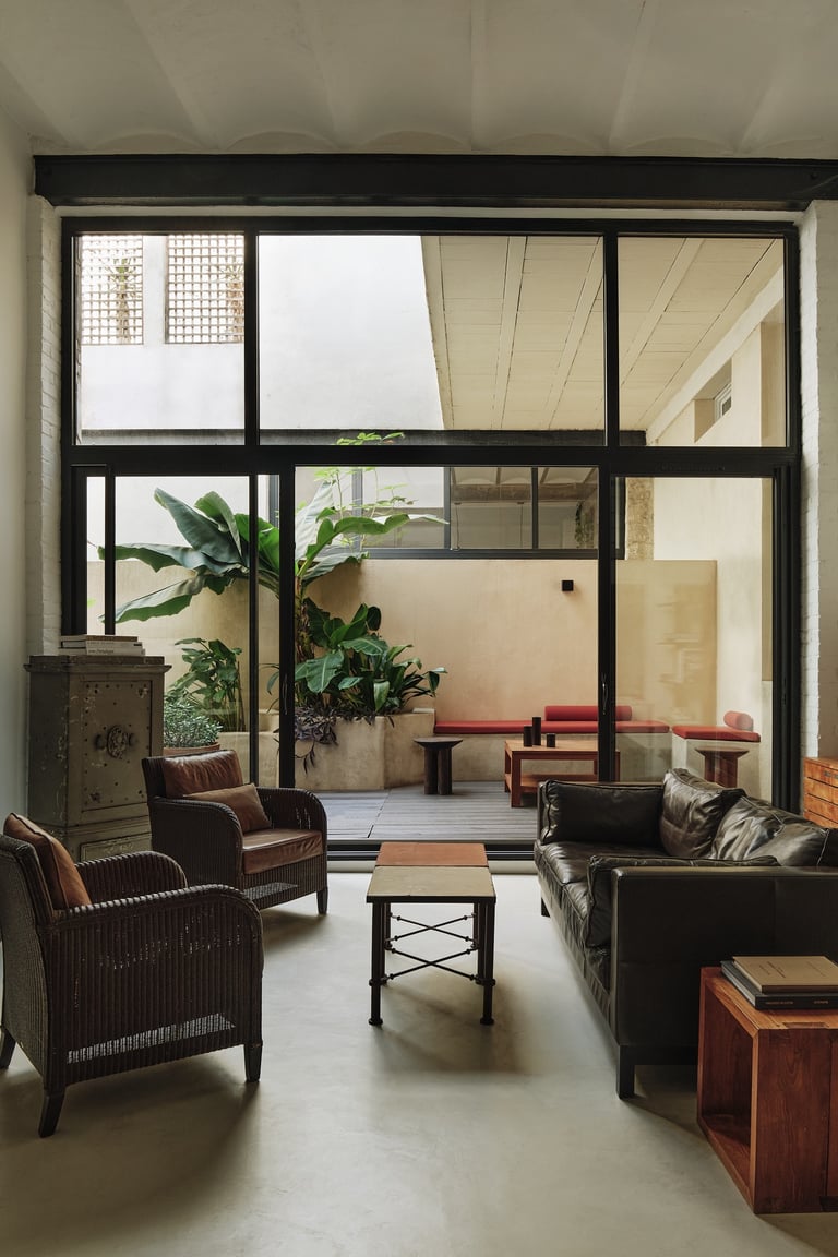 L’existant a constitué le point de départ du projet, pensé comme la recherche d’un nouvel équilibre entre authenticité et confort d’usage. La rénovation de ce loft, issu d’une ancienne usine à biscuits du début des années 1900, s’appuie sur la valorisation de ses caractéristiques architecturales remarquables, notamment une hauteur sous voûtains de 4,60 m, de grandes verrières en fer forgé, des piliers en briques et un parquet en chevron d’origine, anciennement situé dans les bureaux de l’usine, soigneusement conservé. Le projet s’attache à révéler la mémoire industrielle du lieu tout en l’adaptant aux usages contemporains. La terrasse est ainsi conçue comme un véritable jardin d’hiver, prolongeant les espaces intérieurs, et intégrant une végétation généreuse — palmiers et arbres fruitiers — ainsi que des usages dédiés à la vie extérieure : cuisine d’été, salon d’été, banquette et espaces de rangement intégrés. Cet ensemble compose un lieu hybride, à la fois intérieur et extérieur, où patrimoine, matière et usage dialoguent dans une écriture architecturale cohérente et sensible.