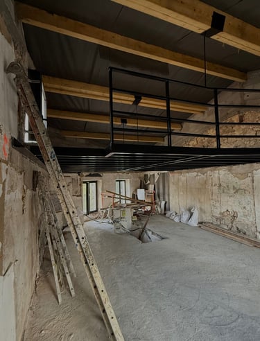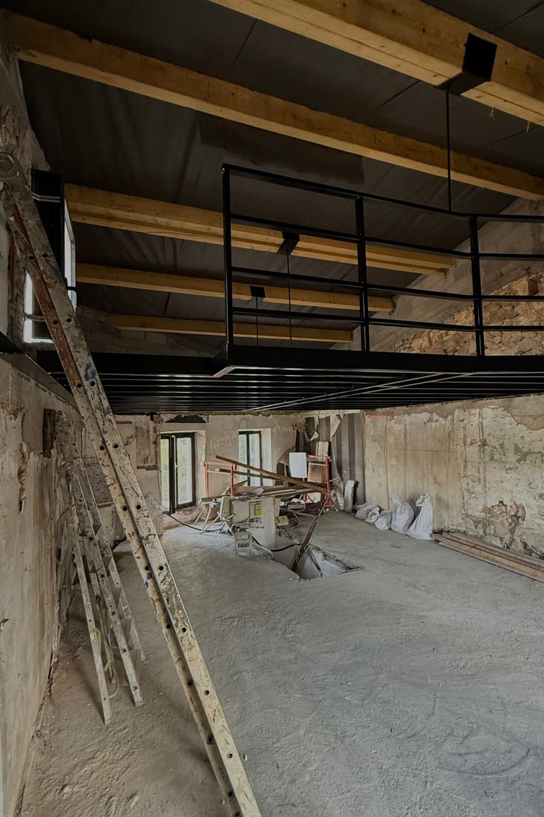 Initialement en état d’insalubrité, l’immeuble a fait l’objet d’une intervention structurelle lourde visant sa pérennisation et sa mise aux normes. Celle-ci comprend le rehaussement du bâtiment, la reprise complète de la charpente ainsi que la création d’un ceinturage périphérique assurant la stabilité et la cohésion de l’ouvrage. Dans ce cadre, le projet architectural exploite pleinement la nouvelle volumétrie sous combles par l’intégration d’une mezzanine suspendue à la charpente. Ce dispositif constructif permet de limiter l’emprise et l’épaisseur structurelle au sol, tout en libérant les volumes et en renforçant la lecture de la structure existante. La mezzanine s’inscrit ainsi comme un élément architectural à part entière, à la fois léger mais nerveux, optimisant les hauteurs disponibles et qualifiant les espaces par une relation directe entre structure, usages et perception des volumes.